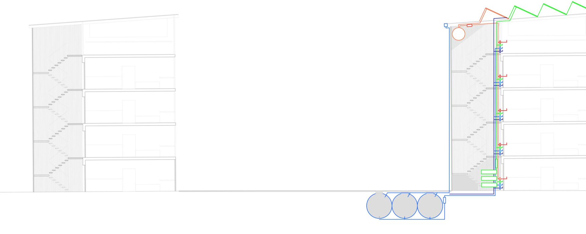 The example in the diagram is high-density housing development in Johannesburg where services, such as the renewable energy, hot water, and grey and rainwater harvesting systems as well as the solid waste recycling systems are all designed around technology which is installed, managed and maintained by small onsite service enterprises (OSEs). Metering these services is then used to pay for their installation and maintenance. Solid waste collection is largely financed through and efficient recycling system to minimize costs for residents. Similarly, small onsite service enterprises will be established to carry out management and maintenance of the development and are catered for in rental costs.