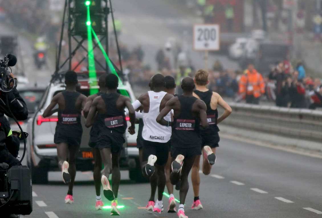 Yesterday, Eliud Kipchoge ran the marathon in under two hours. This is the first time this has ever been done. As well as the Nike ZoomX Vaporfly running shoes and 41 pace-makers, a support car beamed a green laser mark on the road in front of Kipchoge representing 20 seconds below the two-hour pace. So what time did Kipchoge run the marathon? 1 hour 59 minutes and 40 seconds.